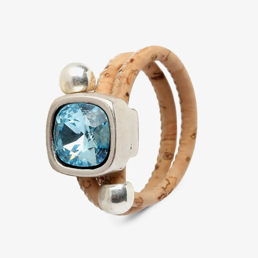 Natural cork ring with blue diamond and bead, handmade with sustainable materials of Portuguese origin.
