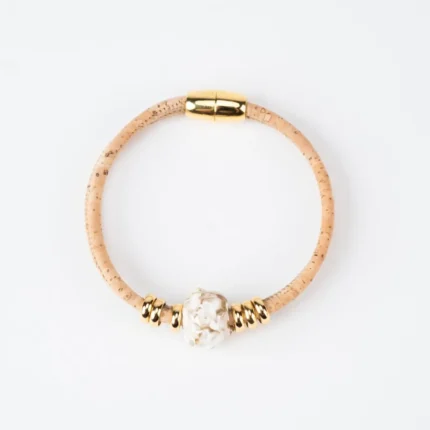 Natural cork bracelet with 2 turns, natural wrinkled ceramic and gold beads