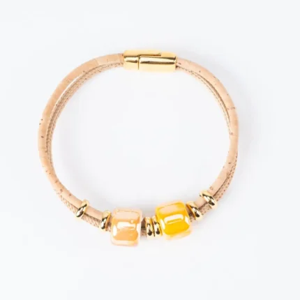 Natural cork bracelet with 2 turns, orange ceramic and gold details